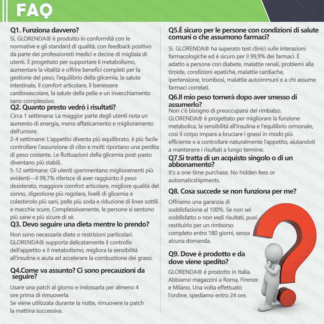 check_circle ๐ฏ Soddisfatti o rimborsati al 100% โ Zero rischi per te:Prova GLORENDAยฎ con totale fiducia. Se non sei soddisfatto per qualsiasi motivo, ricevi un rimborso completo โ senza domande e senza bisogno di reso. Il tuo percorso di salute รจ al sicuro con noi.